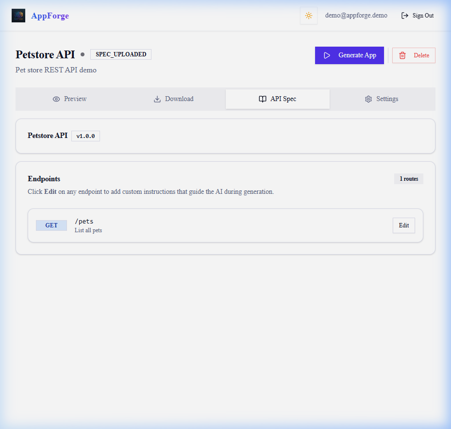 Upload your OpenAPI specification, select an LLM, and instantly generate a complete, deployable Next.js App Router application powered by Shadcn UI and Prisma.